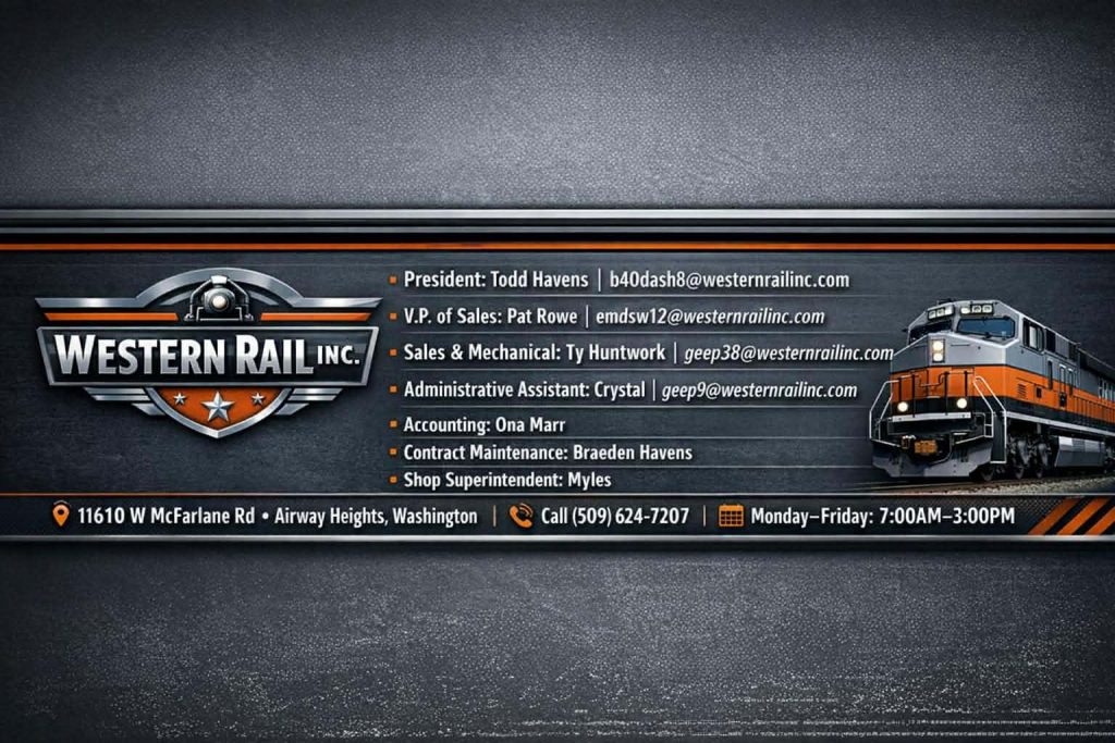 Western Rail’s Corporate Offices are situated on 26 acres of BNSF served line, 2 rail line locomotive storage and full service locomotive dismantling yard.  We at any one time will have up to 30 locomotives in inventory at our Airway Heights, Wa. Facility along with 10 to 15 more stored at our 6-bay remanufacturing shop located in Usk, Wa. and our new multimillion dollar Paint/Blasting Facility